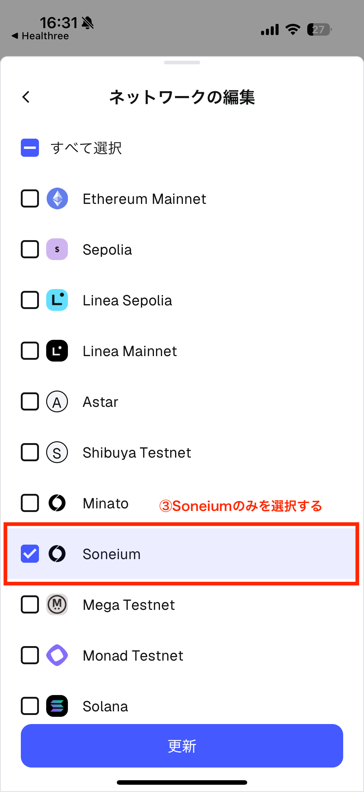 - 「有効なネットワークを使用する」の「編集」ボタンを押下すると添付画像2のようにネットワーク選択画面が開きますので、「Soneium」のみを選択し「更新」ボタンを押下